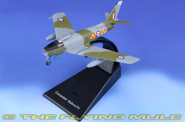 | Canadair Sabre Mk 4 | | 4.75" | | 4.5" | Designed to meet a USAAF requirement for a day-fighter/escort fighter/dive-bomber, the F-86 was first flown on October 1st, 1947. The Sabre's swept-wing "flying tail" configuration and a hydraulic flight-control system were some of its many firsts in technology and design that have now become standard for jet-powered aircraft. Armed with six 50 caliber machine guns, the F-86 saw extensive action in the Korean War, where it was often pitted against the MiG-15. The Sabre pilot had to be in visual contact and within gun range of the enemy in order to attempt a shoot-down, thereby making this aircraft the last true "dogfighter" in Air Force inventory. © Copyright 2003-2025 The Flying Mule, Inc. The Atlas Editions "Jet Age" range presents affordable, ready made diecast models of military aircraft in 1:144 and 1:200 scale. Atlas Editions diecast airplanes feature: - Diecast metal and plastic construction.