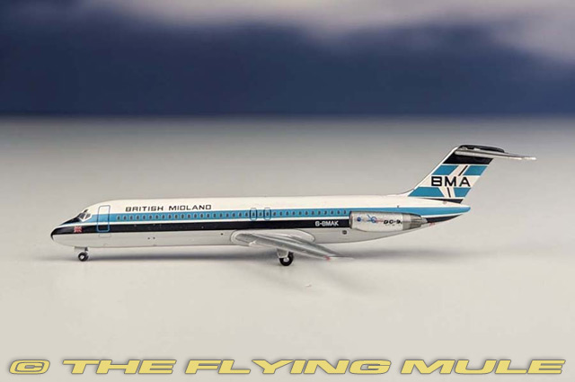 Please note: An optional display stand is available separately if you wish to display this model "in-flight". Designed as a short-range twin-jet transport, the DC-9 was first flown on February 25th, 1965. Since shorter routes frequently required operation from small airports, the design focused on short-field performance. The most significant decision was to move the engines from under the wings to the tail, enabling the use of full-span flaps, reducing the possibility of foreign-object ingestion and lowering ground clearance for easier servicing at small terminals. The DC-9 spawned many variants leading to the MD-80, MD-90 and Boeing 717. In total, almost 2,500 aircraft were built over a period of more than 40 years. © Copyright 2003-2025 The Flying Mule, Inc. The AeroClassics "1:400" range presents higly-detailed, ready-made diecast models of civilian aircraft in 1:400 scale. AeroClassics models are produced in extremely limited quantities, making them highly desirable to collectors. AeroClassics 1:400 diecast airplanes feature: - Diecast metal construction, including wings and tail surfaces.