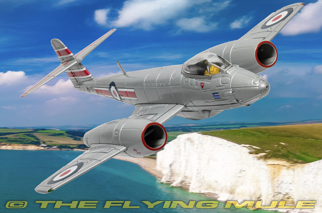 Corgi's 1:72 scale Meteor series includes both early and late variants of the F. Mk 8. The early F 8 variant features longer engine nacelles and obstructed visibility behind the pilot, with the later featuring shorter engine nacelles with a larger intake and a full canopy. Four 20mm cannon guns - the aircraft's main weapons - are visible just below the cockpit. Some releases include rockets mounted under the outer wings, and some include a ventral mounted fuel tank with under-wing tanks. The stout metal landing gear with splash guard fenders are easy to install for ground display.