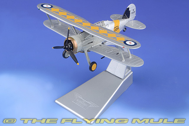 Corgi's 1:72 scale Gladiator series includes the early two bladed propeller Mk I, the three bladed propeller Mk II and a Sea Gladiator (an Mk II fitted with an arrester hook). The models in this series faithfully recreate this aircraft, the last RAF biplane fighter. Features include fine gauge wire to simulate the structural bracing wires found between the wings the rear control surfaces, two machine gun pods under the lower wing and two almost hidden synchronized guns mounted on the sides of the fuselage. The radial engine is nicely detailed and clearly visible through the cowling.