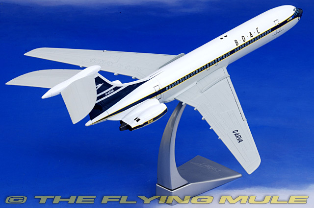 G-ARVA was the first production VC-10 and the first of twelve to enter service with BOAC (British Overseas Airways Corporation), being delivered to London Heathrow Airport on 8th December 1964. It gave faithful service until being sold to Nigeria Airways as 5N–ABD on 29th September 1969, in whose hands it crashed short of finals at Lagos, just two months later. The Corgi model is depicted in BOAC's delivery scheme, which was changed to the later blue and gold livery in 1965. On 1st April 1974, BOAC merged with BEA (British European Airways) to form today's British Airways. However, by that time the majority of standard VC-10s had been sold and only a few survived in service to see the new livery, which continued on the airline's Super VC-10s until they too, were finally disposed of.