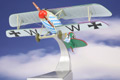 Corgi's 1:48 scale Albatros D.V series captures the unmistakable lines of the real aircraft with simulated stretched fabric covering and brilliant early cammo patterns. Fine gauge wire is used to represent the structurally significant bracing wires found on the actual aircraft. The water-cooled Mercedes engine is wonderfully replicated, with six cylinder heads, engine exhaust stacks and a liquid cooling system leading to the radiator on the top wing. A detailed pilot figure sits behind the twin LGM 08/15 machine guns. The model rests on rolling rubber tires that accurately simulate the gray color that vulcanized natural rubber takes on after prolonged exposure to sunlight.