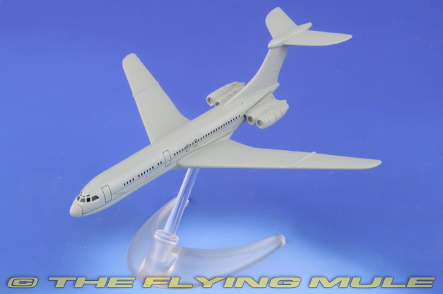 Designed to meet a need for a jet aircraft that could comfortably take off from and land on shorter runways, the Vickers VC10 was first flown on June 29, 1962. This long-range British airliner holds a long-standing record for the fastest Atlantic crossing by a sub-sonic airliner (only the supersonic Concorde has beaten its record). Advanced even for its time, the VC10 was designed with a quadruplicated automatic flight control system, which enabled fully automatic landings in zero-visibility conditions. Despite its promise, the VC10 only served as an airliner for 15 years; in the 1970s it was removed from service because of the high noise levels it produced on departure and approach. © Copyright 2003-2026 The Flying Mule, Inc. The Corgi "Showcase Collection" range presents affordable, ready-made diecast models of military and civilian aircraft. Corgi "Showcase Collection" diecast airplanes feature: - Diecast metal construction with some plastic components.