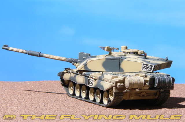 Dragon's 1:72 scale Challenger 2 is constructed with an intelligent mix of diecast metal and plastic, with the entire hull and large low-profile turret in plastic for the highest possible detail. A discreet, internally-mounted weight gives the model its heft. The turret features an elevating cannon with muzzle reference sensor, smoke grenade launchers and a removable 7.62 machine gun with attached ammo box. The hull has upgraded armor side skirts, hand-painted headlights and fire extinguishers, separately-applied cabling on the sides and external fuel tanks mounted to the rear. The wheels feature simulated rubber tires and hexagonal shaped nuts and bolt ends, visible under close scrutiny.