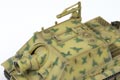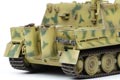 Dragon's 1:72 scale Sturmtiger Tank is constructed almost entirely from plastic, which allows for the greatest possible detail. Close scrutiny of this model reveals a simulated Zimmerit coating, engine exhaust stacks with heat shields, weathered rubber tracks, separately-applied track repair equipment and individually visible nuts and bolts on the interleaved road wheels. The gun casement's thick plates of interlocking armor are accurately rendered, and the individual shafts of the exhaust gas ring are visible inside the pivoting 380mm rocket launcher. The driver's slotted window, defensive 7.92mm machine gun and headlight are clearly seen, and a loading crane with hand-operated crank is mounted to the rear of the superstructure.