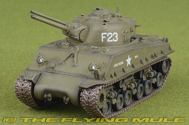 The Korean War broke out when North Korean troops and accompanying armor suddenly began rolling across the 38th Parallel on 25 June 1950. The M4 Sherman tank played an important part on the US side in the three-year conflict. One such type used was the POA-CWS-H5, a flamethrower version of the M4AE8 Sherman. Mounted in the turret was the original 105mm howitzer, with a coaxial flamethrower gun added alongside it. Flame tanks were developed as a solution to the difficulties of eradicating the enemy holed up in bunkers and caves. The pilot model of the M4 was completed in September 1941, and the Sherman became the most widely produced tank of the war. The M4 Sherman defeated heavier tanks with superior numbers, and by using outflanking tactics to strike thinner enemy flank armor. Shermans also achieved success with progressively upgunned models and by working with tank destroyers. The Sherman tank--named by the British--was fast, maneuverable, mechanically reliable, easy to manufacture, and effective in its infantry support role. It served with the US Army and Marines during World War II, and the US transferred large numbers to the United Kingdom and allied forces of many countries. © Copyright 2003-2025 The Flying Mule, Inc. The Dragon Models "1:72 Dragon Armor Collector Series" range presents highly-detailed, ready-made plastic models of military vehicles. Dragon Armor tanks require no glueing or painting. Each model is an instant display piece or diorama centerpiece straight from the box and is 100% true to scale... these don't look like model tanks, they look like tanks!. Color, camouflage and unit markings are carefully researched for Maximum authenticity, marking the difference between and authentic scale model tank and a "toy" tank. Dragon Models "1:72 Dragon Armor Collector Series" display model vehicles feature: - Molded plastic construction (some releases include diecast metal components).