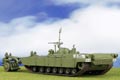 The M1 Abrams Panther II is an M1 Abrams Main Battle Tank specially modified for mine clearing missions. Modifications include the removal the turret, and installation of mine rollers or plough on the front of the vehicle and Omnitech's Standardized Teleoperation System. It can be operated up to 2,600 feet away and can clear a 5,000-square-meter area within an hour. The plough and roller kit attachments push mines out of the way when clearing roads without damaging the vehicle.