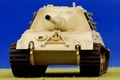 Jagdtiger development started in February of 1943 and on October 20th of 1943, a wooden mock-up was presented to Adolf Hitler. The Jagdtiger's role was to support infantry and combat armored vehicles at long ranges. Two prototypes, one with Porsche suspension (made up of eight roadwheels) and one with Henschel suspension (made up of nine roadwheels) were completed in February of 1944. Its first designation was Jagdpanzer IV, but later on it was named Jadgtiger and received number Sd.Kfz.186. Production was planned to start in December of 1943 but started in July of 1944 but Pz.Kpfw V Panther production received priority and Jagdtiger production was slow.
