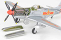 Forces of Valor's 1:72 scale P-51D Mustang is constructed using an intelligent mix of diecast metal and plastic, with solid metal wings and fuselage and plastic components in those areas requiring greater detail. The focal point of this beautiful model is the Rolls-Royce V-12 engine, visible beneath two correctly-modeled removable cowlings. Engines with this level of detail are uncommon in this scale - this one has been meticulously hand-painted, with details seen in the engine block, valve covers, exhaust stacks, supercharge and engine bay framing. Other fine details include a hand-painted hydraulic line inside the wheel wells, and three machine gun ports on each wing with shell casing vents below.