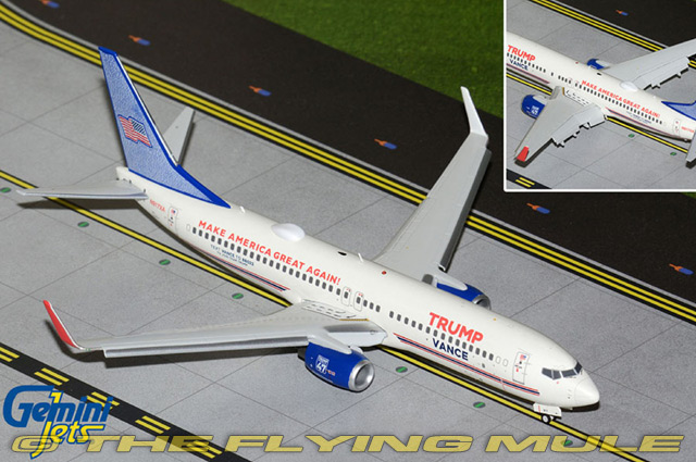 | | Code: GJ-G2TRU1372F Status: Sold out - Discontinued We regret this item is no longer available for sale. Please see the product description for links to similar items we still have available. | GeminiJets Gemini 200 G2TRU1372F Boeing 737-800 Diecast Model Trump-Vance Campaign, N917XA, 2024 Presidential Election, Flaps Down Configuration | |