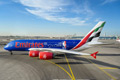 The new livery features a striking blue gradient across the fuselage, punctuated by the NBA logo. The distinct Emirates lettering has transformed from its unique gold font to red, appearing alongside an illustration of a basketball bouncing between the NBA and Emirates logos. The fuselage's new look is complemented by vibrant red engine cowls emblazoned with the distinct white calligraphy that makes up the Emirates logo.