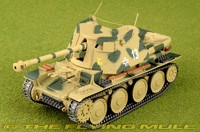 Designed to meet a German need for an anti-tank weapon that was more powerful and more mobile than towed anti-tank guns like the Pak 36, the Marder III served from 1942 to 1945. This makeshift tank destroyer was based on obsolete German tanks and captured French vehicles, and was built on a Panzer 38(t) chassis. Armed with captured Soviet 76.2mm guns, early Marder IIIs had open tops and only weak armor on the front and sides. Later models employed 7.5cm PaK 40 anti-tank guns and provided marginally better protection for the crew, but by 1944 the Marder III was phased out of production in favor of fully armored vehicles. © Copyright 2003-2025 The Flying Mule, Inc.