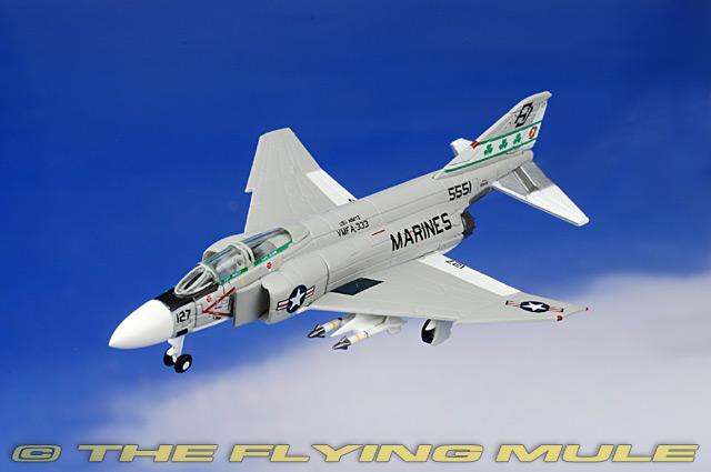 The US Marine Corps, commonly known as the Marines, is the USA’s marine infantry and therefore part of the Navy. This corps comprises 200,000 soldiers who not only serve on ships but also operate land and air craft. This included unit VMFA-333, which was based on the aircraft carrier USS Nimitz in 1977, with the McDonnell Douglas F-4J “PhantomII” as its primary weapons system. Its escutcheon was the Irish shamrock, clearly visible on the tail unit of the fighter bomber with the registration 127. Designed as a fleet defense fighter for the US Navy, the F-4 Phantom was first flown on May 27, 1958. This twin-engine, long-range all-weather fighter/bomber proved highly adaptable and served in the Marine Corps and the US Air Force as well as in the Navy. During the Vietnam War, it was the principal air superiority fighter for the Navy and the Air Force and was also used for reconnaissance and ground attack. The Phantom continued to serve well into the 1970s and 1980s and even flew missions during the first Gulf War. Finally phased out by the F-14, F-16 and F/A-18, the Phantom was retired in 1996. © Copyright 2003-2025 The Flying Mule, Inc. The Herpa "Wings" range presents detailed, ready-made diecast models of civilian and military aircraft. Herpa "Wings" diecast airplanes feature: - Diecast metal construction with some plastic components.