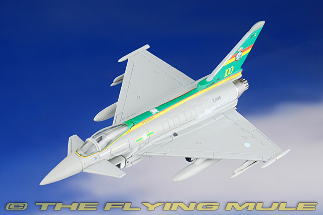 Formed back in 1912, the squadron celebrated its anniversary with a special livery in the unit's colors, also sporting its two emblems on the stabilizer and dorsal air break. Designed as part of a co-operative effort by Germany, Italy and the UK to produce an air superiority fighter, the Eurofighter was first flown on March 27th, 1994. The Eurofighter is a single-seat, twin-engine, agile combat aircraft used in air-to-air, air-to-ground and tactical reconnaissance roles. It is intentionally aerodynamically unstable, which gives it its high levels of agility-but this means the Typhoon is controlled by a computerized "fly by wire" system instead of by its pilot. The Eurofighter's first rate performance is matched by excellent all round vision and by sophisticated attack, identification and defense systems and stealth technology. © Copyright 2003-2025 The Flying Mule, Inc. The Herpa "1:200 Wings" range presents detailed, ready-made diecast models of civilian and military aircraft in 1:200 scale. Herpa "1:200 Wings" diecast airplanes feature: - Diecast metal construction with some plastic components.