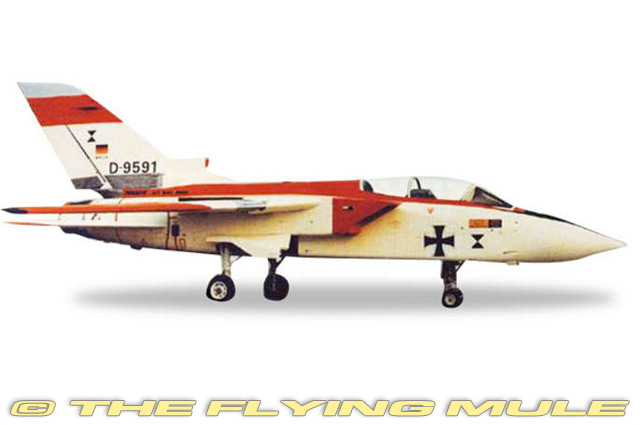 On August 14, 1974, the P.01, the first prototype of the Tornado multirole combat aircraft took off for its maiden flight from the Bavarian town of Manching. Please note: This model features wings permanently positioned in the forward-swept position for low-speed flight and take-off/landing. Designed in collaboration with Britain, West Germany and Italy, the Tornado was first flown on August 14th, 1974 and is thought by many to be the most important military aircraft in Western European history. Nicknamed "The Flying Fin" because of its large tail fin, the Tornado has a variable wing sweep design and is capable of taking off and landing on short airstrips. It is equipped with terrain-following radar, which allows for hands-off, low-level flight in any weather. There are three primary versions: an electronic combat/reconnaissance version, an interceptor and a highly versatile strike fighter-bomber capable of carrying almost all of NATO's air-launched weapons. © Copyright 2003-2025 The Flying Mule, Inc. The Herpa "1:200 Wings" range presents detailed, ready-made diecast models of civilian and military aircraft in 1:200 scale. Herpa "1:200 Wings" diecast airplanes feature: - Diecast metal construction with some plastic components.