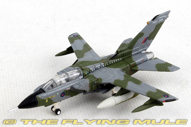 Entering service back in 1980 with the Tri-National Tornado Training Establishment (TTTE), the last of these fighter-bombers were retired by the RAF in spring of 2019. Three aircraft from IX and 31 Squadrons performed a three-day farewell tour throughout the United Kingdom. This second aircraft from No 31 Squadron was repainted with the two-tone camouflage scheme which was applied to the Tornados in the 1980s when they were first delivered. Small badges of all units that operated the Tornado in the past 40 years adorn the spine of the aircraft. Designed in collaboration with Britain, West Germany and Italy, the Tornado was first flown on August 14th, 1974 and is thought by many to be the most important military aircraft in Western European history. Nicknamed "The Flying Fin" because of its large tail fin, the Tornado has a variable wing sweep design and is capable of taking off and landing on short airstrips. It is equipped with terrain-following radar, which allows for hands-off, low-level flight in any weather. There are three primary versions: an electronic combat/reconnaissance version, an interceptor and a highly versatile strike fighter-bomber capable of carrying almost all of NATO's air-launched weapons. © Copyright 2003-2025 The Flying Mule, Inc. The Herpa "1:200 Wings" range presents detailed, ready-made diecast models of civilian and military aircraft in 1:200 scale. Herpa "1:200 Wings" diecast airplanes feature: - Diecast metal construction with some plastic components.