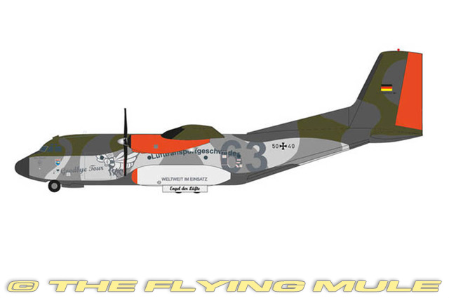 | Transall C-160 | | 6.25" | | 7.75" | Designed as a joint venture between France and Germany to produce a military transport, the C-160 was first flown on February 25th, 1963. © Copyright 2003-2025 The Flying Mule, Inc. The Herpa "1:200 Wings" range presents detailed, ready-made diecast models of civilian and military aircraft in 1:200 scale. Herpa "1:200 Wings" diecast airplanes feature: - Diecast metal construction with some plastic components.