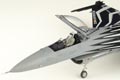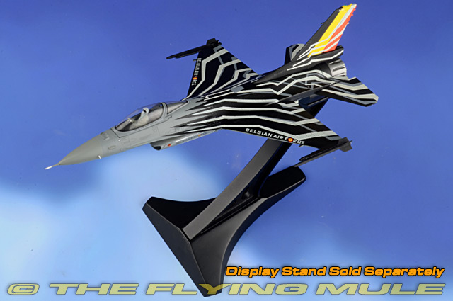 Herpa's 1:72 scale F-16 is constructed of solid diecast metal. Very few plastic parts are used, yet the finer points - detailed landing gear, engine exhaust, cockpit interior and panel lines and rivet details - are reminiscent of those usually only found on plastic models. Even subtle details have been included, such as radar warning antenna "beer cans," static discharge wicks and angle of attack vanes. This model, available as either a single-seat C variant or a two-seat D variant, is highly configurable, with movable stabilators, positionable rudder, a hinged canopy with extending and retracting actuator and a variety of different weapons configurations.