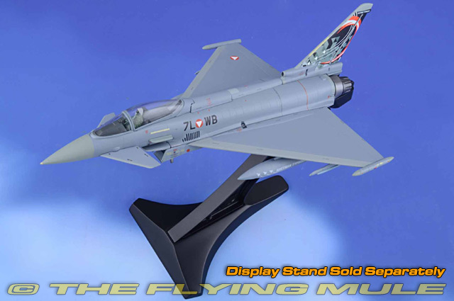 Please note: An optional display stand is available separately if you wish to display this model "in-flight". Designed as part of a co-operative effort by Germany, Italy and the UK to produce an air superiority fighter, the Eurofighter was first flown on March 27th, 1994. The Eurofighter is a single-seat, twin-engine, agile combat aircraft used in air-to-air, air-to-ground and tactical reconnaissance roles. It is intentionally aerodynamically unstable, which gives it its high levels of agility-but this means the Typhoon is controlled by a computerized "fly by wire" system instead of by its pilot. The Eurofighter's first rate performance is matched by excellent all round vision and by sophisticated attack, identification and defense systems and stealth technology. © Copyright 2003-2025 The Flying Mule, Inc. The Herpa "1:72 Wings" range presents detailed, ready-made diecast models of military aircraft in 1:72 scale. Herpa "1:72 Wings" diecast airplanes feature: - Diecast metal construction with some plastic components.