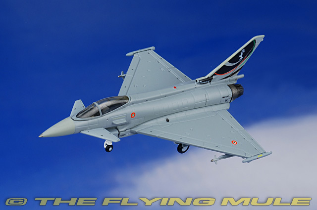 | Eurofighter Typhoon F.Mk 2 | | 3" | | 2.25" | Designed as part of a co-operative effort by Germany, Italy and the UK to produce an air superiority fighter, the Eurofighter was first flown on March 27th, 1994. The Eurofighter is a single-seat, twin-engine, agile combat aircraft used in air-to-air, air-to-ground and tactical reconnaissance roles. It is intentionally aerodynamically unstable, which gives it its high levels of agility-but this means the Typhoon is controlled by a computerized "fly by wire" system instead of by its pilot. The Eurofighter's first rate performance is matched by excellent all round vision and by sophisticated attack, identification and defense systems and stealth technology. © Copyright 2003-2025 The Flying Mule, Inc. The Hogan Wings "M-Series" range presents detailed, ready-made diecast models of military aircraft in 1:200 scale. Prized by collectors worldwide these little gems can build an impressive diecast collection. Don't be fooled by their small size, the level of detail on these models outclasses several larger-scale diecast aircraft ranges and has to be seen to be believed. Build a highly-detailed, accurate and wide-ranging military aircraft collection on a single display shelf and for an attractive price with Hogan Wings' "M-Series". Hogan Wings "M-Series" diecast airplanes feature: - Diecast metal construction with a minimum of plastic components.