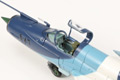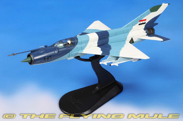 Hobby Master's 1:72 scale MiG-21 is constructed in diecast metal with only the smallest amount of plastic used. The configurable cockpit canopy provides a clear view of the interior and pilot figure and the central air brake is deployable. A G-P9 cannon pod with hand-painted 23mm twin-barrel 23mm can be seen below the cockpit. The wing is crafted of solid metal, and structural details can be seen inside the wheel wells and inboard gear doors. Each wingtip has an integrated fence and air date sensors. Ordnance includes removable fuel tanks and K-13A air-to-air missiles.