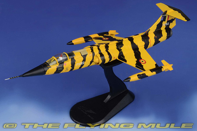 Hobby Master's 1:72 scale F-104 Starfighter is a good looking model with many quality features. The exceptionally long fuselage is constructed in diecast metal, with plastic side-mounted engine intakes. The rear turbine blades and the exhaust with its "turkey feathers" are some of the high points of this model, along with a canopy that opens to reveal an ejection seat and pad printed front and side instrument panels. The M61 Vulcan Gatling gun port is beautifully recreated, and the complex main landing gear is accurately rendered, securely locking into place for ground display. Most releases include removable wingtip fuel tanks, with fuselage mounted missiles on some versions.