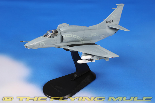 Hobby Master's 1:72 scale A-4 Skyhawk is a sturdy model constructed almost entirely from diecast metal with only the smallest amount of plastic used. This model has an opening canopy with pad-printed dials and gauges, control stick and pilot seat. Each release features a pair of 20mm cannons, a delicate refueling probe and a variety of wing-mounted weapons ordnance and fuel tanks. The series includes the early B and E variants as well as the F and M variants, which have a hump on the top of the fuselage to house upgraded avionics (also seen on retrofitted E variants).