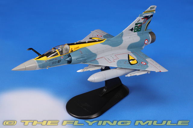 Hobby Master's 1:72 scale Mirage 2000 is a sleek diecast model with crisp panel lines, manufactured with only the smallest amount of plastic. The side mounted engine intakes with fixed inlet cones are constructed in plastic for greater accuracy and the configurable canopy provides a clear view of the instrument panel, control stick and ejection seat. The rear turbine blades are easily seen inside the exhaust nozzle and the large refueling probe is mounted on the nose (in most releases). The thin yet solid metal wing features exceptional panel line details, flap and aileron actuator arms at the rear and a complete set of removable wing mounted ordnance.