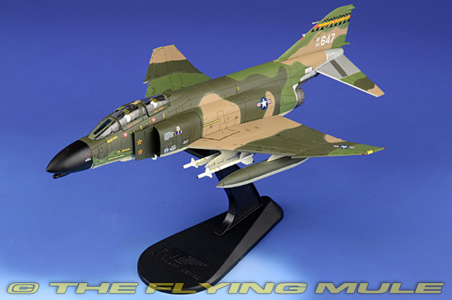 Hobby Master's 1:72 scale F-4 Phantom II is highly detailed and very popular among collectors. This model has an intricately crafted fuselage, with rear and forward canopies that open to expose cockpit interior details such as instrument panel dials, control stick and ejector seat handles. The solid metal wing has raised wing-tips and a dog-toothed leading edge that blends seamlessly into the fuselage. Each release includes a full complement of removable ordnance. Variants in this series have notable differences in the nose and/or tail fin and slight variations in the engines' exhaust. Carrier-based variants have elevators with a raised leading edge, and land-based variants have standard leading edges.