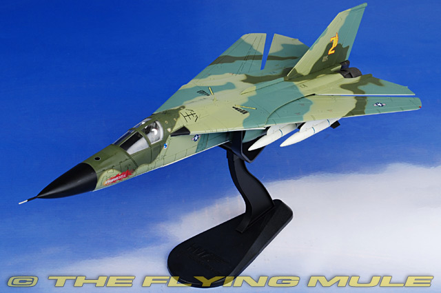 Hobby Master's 1:72 scale F-111 Aardvark is a large model in this scale with many fine features, such as articulating swing wings with under-wing ordnance, configured with ball and socket mounts for secure and easy positioning. The large canopy is removable for easy viewing of the cockpit's interior and crew figures, and structural component details can be seen inside the main gear bay. The landing gear has been included as complete subassemblies for quick and easy configuration. Variants in this series include the early F-111A, the F-111C with longer wings and the EF-111A Raven with electronic warfare equipment bulge on top of the fin.