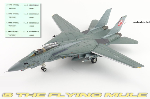 Wolfpack sticker on tail fins can be removed. Includes decal sheet to apply Maverick and Goose names to canopy rail.