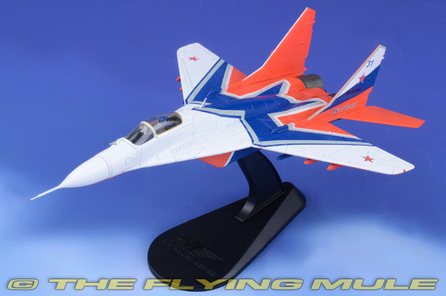 In 1991 the Russian Aerobatic Team the Strizhi (Swifts), performed their first demonstration when they visited Sweden's Uppsala airbase. MiG-29 31 Blue c/n 29607729380 was produced in 1990 and became part of the team. The Strizhi members are made up of pilots from the 237th Guards Proskurov Aircraft Demonstration Centre based in Kubinka Air Base. When not flying with the demo team, these pilots are fighter training instructors. In 2019 the Strizhi flew at the Aviamiks Air Show, MAKS-2019 Moscow International Airshow and normally about 50 per year. Designed to help the Soviet Union attain air superiority, the MiG-29 fighter was first flown on October 6th, 1977. The MiG-29, known as the "Fulcrum," has a high-mounted bubble canopy and twin jet engines with diagonal-shaped air intakes and large exhausts. Its tapered, swept-back wings and boom-mounted tail fins give it its classic look. Armed with medium and short-range missiles and unguided weapons for ground and sea-surface targets, the MiG-29's sight is a helmet-mounted system-the pilot chooses his targets by looking at them. Even today the Fulcrum remains a potent adversary, and will remain in service for at least another decade. © Copyright 2003-2025 The Flying Mule, Inc. The Hobby Master "1:72 Air Power Series" range presents detailed, ready-made diecast models of military aircraft. Hobby Master "1:72 Air Power Series" diecast airplanes feature: - Diecast metal construction with some plastic components.