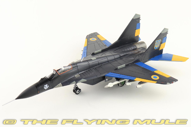 The Ghost of Kyiv is the nickname given to a mythical MiG-29 Fulcrum flying ace credited with shooting down six Russian planes over Kyiv during the Kyiv offensive on 24 February 2022. Various reports, including the Security Service of Ukraine, made similar claims. The Ghost of Kyiv has been credited as a morale booster for Ukrainians during the Russo-Ukrainian War. In February, 2025, the Ukrainian Air Force released a video on social media featuring a MiG-29 painted in a matt-black finish with blue and yellow accents and a white "Ghost of Kyiv" emblem on the nose. Whether this is a one-time experiment, a new approach to aircraft camouflage, or simply a way to inspire Ukrainian forces and the public, one thing is certain - the mysterious black MiG-29 has captured the world's attention, becoming yet another symbol of Ukraine's determination in its ongoing battle for survival. Designed to help the Soviet Union attain air superiority, the MiG-29 fighter was first flown on October 6th, 1977. The MiG-29, known as the "Fulcrum," has a high-mounted bubble canopy and twin jet engines with diagonal-shaped air intakes and large exhausts. Its tapered, swept-back wings and boom-mounted tail fins give it its classic look. Armed with medium and short-range missiles and unguided weapons for ground and sea-surface targets, the MiG-29's sight is a helmet-mounted system-the pilot chooses his targets by looking at them. Even today the Fulcrum remains a potent adversary, and will remain in service for at least another decade. © Copyright 2003-2025 The Flying Mule, Inc. The Hobby Master "1:72 Air Power Series" range presents detailed, ready-made diecast models of military aircraft. Hobby Master "1:72 Air Power Series" diecast airplanes feature: - Diecast metal construction with some plastic components.