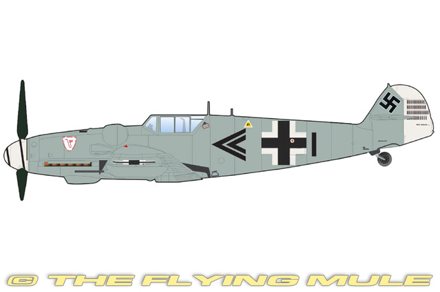 Walter Dahl was a German Luftwaffe fighter ace who flew the Messerschmitt Bf 109G with III./JG 3 during World War Two. Serving on the Eastern Front and later in defense of the Reich, Dahl became one of the leading Experten of Jagdgeschwader 3. Flying the Bf 109G, he achieved numerous aerial victories against Soviet and Allied aircraft, benefiting from the fighter's strong climb rate, speed, and firepower. Dahl eventually became Gruppenkommandeur of III./JG 3 and later Geschwaderkommodore. His aircraft often carried distinctive personal markings, and his combat record reflected the intense air fighting faced by JG 3 throughout the war. Designed to meet a Luftwaffe need for a single-seat fighter/interceptor, the Messerschmitt Bf 109 was first flown on May 28th, 1935. Its all-metal construction, closed canopy and retractable gear made the Bf 109 one of the first true modern fighters of WWII. This versatile aircraft served in many roles and was the most produced aircraft of the war and the backbone of the Luftwaffe, and was flown by Germany's top three aces, who claimed a total of 928 victories between them. Armed with two cannons and two machine guns, the Bf 109's design underwent constant revisions, which allowed it to remain competitive until the end of the war. © Copyright 2003-2026 The Flying Mule, Inc. The Hobby Master "1:48 Air Power Series" range presents detailed, ready-made diecast models of military aircraft. Hobby Master "1:48 Air Power Series" diecast airplanes feature: - Diecast metal construction with some plastic components.