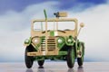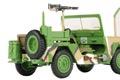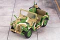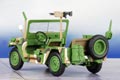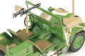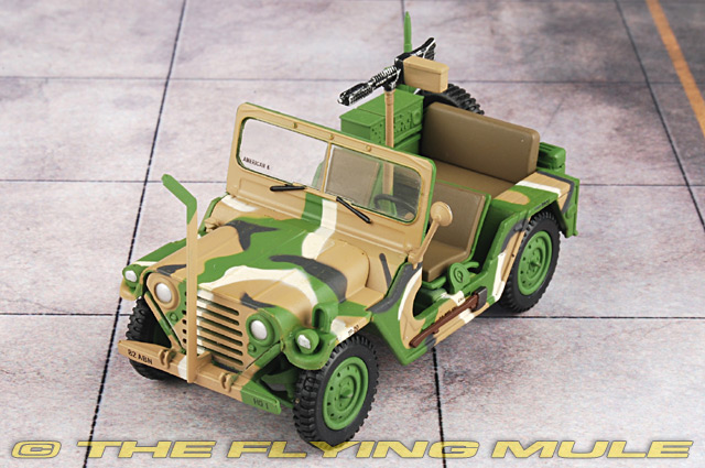 Hobby Master's 1:48 scale Jeep packs a lot of scale detail into a small package. The chassis and drive train is constructed almost entirely in diecast metal providing a nice weighted feel to the model. The interior features a pad-printed instrument panel, separately painted seat cushions and scale steering wheel and transmission gear-shifts levers. Each release highlights a variety of cabin equipment configurations such as a center mounted machine gun, open or closed ragtop and rear mounted radio equipment (See Photos). Separately applied battlefield equipment includes shovels, hatchets, jerry cans and a spare tire. Underneath the model the drive train and leaf-spring suspension are clearly visible.