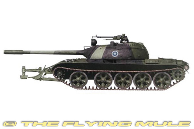Hobby Master's 1:72 scale T-55 is constructed with an intelligent mix of diecast metal and plastic, which gives this model maximum scale replication. One of the highlights of this T-55 is an extraordinarily detailed turret, which is constructed of diecast metal combined with plastic components such as the separately-applied commander and gunner's hatches with scale rivets and hinges, the floodlights and the DShk 108mm heavy machine gun. The mantlet has a simulated canvas cover and the cannon is made of solid diecast metal. The hull is constructed of plastic, with separately-applied equipment storage boxes, tow cables and spare track. The lever arms of the torsion bar suspension can be seen on the model's underside.