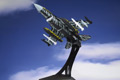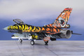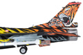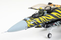 JC's 1:72 scale F-16 is constructed of solid diecast metal. Very few plastic parts are used, yet the finer points - detailed landing gear, engine exhaust, cockpit interior and panel lines and rivet details - are reminiscent of those usually only found on plastic models. Even subtle details have been included, such as radar warning antenna "beer cans," static discharge wicks and angle of attack vanes. This model, available as either a single-seat C variant or a two-seat D variant, is highly configurable, with movable stabilators, positionable rudder, a hinged canopy with extending and retracting actuator and a variety of different weapons configurations.