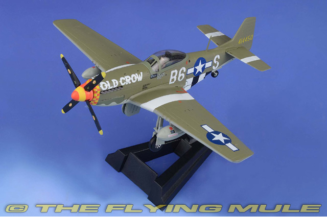 Captain C.E. Bud Anderson served two combat tours with the 363rd FS/357th FG during WWII. The 357th FG was stationed at RAF Leiston, England and Anderson flew a P-51D s/n 44-14450 B6-S (B6 signified the 363rd FS) adorned with his familiar Old Crow nickname. Bud flew 44-14450 on 66 missions and added 11.25 aerial victories to his total. Bud Anderson never had to abort a mission and his aircraft never suffered a hit from enemy aircraft and he returned state side in February 1945 as a Major. Designed to meet an RAF requirement for fighter-bomber and reconnaissance aircraft, the P-51 Mustang was first flown on October 26th, 1940. This versatile aircraft was capable of escorting bombers on long-range missions, engaging in dogfights, and dropping down to destroy German targets on the ground. At least eight versions of the P-51 were produced, but it was the definitive P-51D that gave the Mustang its classic warbird appearance. Britain and the US both tested the airframe with the Rolls-Royce Merlin engine, which gave the aircraft tremendous performance gains. The Truman Senate War Investigating Committee called the Mustang "the most aerodynamically perfect pursuit plane in existence." © Copyright 2003-2025 The Flying Mule, Inc. The JC Wings "1:72 Military" range presents detailed, ready-made diecast models of military aircraft in 1:72 scale. JC Wings 1:72 Military diecast airplanes feature: - Diecast metal construction with some plastic components.