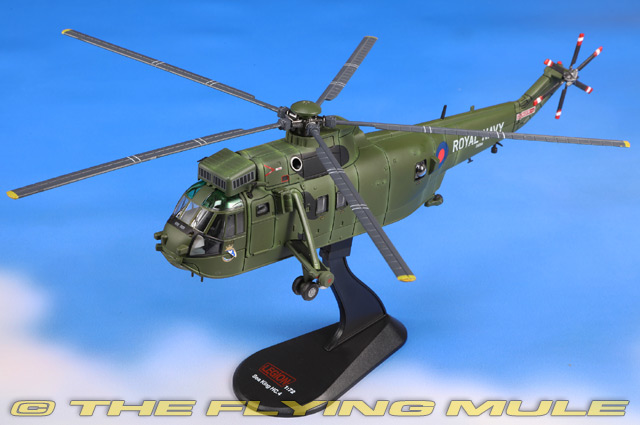 846 Naval Air Squadron of the Royal Navy Fleet Air Arm operated the Westland Sea King HC.4, a dedicated commando support helicopter. Known as the "Junglies," the squadron specialized in amphibious and land-based operations, providing troop transport, resupply, and casualty evacuation. The Sea King HC.4, with its iconic green livery, robust design, and exceptional range, was essential in operations such as the Falklands War, Iraq, and Afghanistan. Designed to meet a US Navy requirement for an all-weather amphibious helicopter, the Sikorsky SH-3 Sea King first flew on March 11, 1959. Originally a submarine hunter-killer, the Sea King has since been used in a variety of operations, from search and rescue, executive transport and communications to anti-ship and airborne early warning. Its five main rotor blades and tail section fold for stowage aboard aircraft carriers, and its hull can remain temporarily watertight for water landings-a risky maneuver attempted only in emergencies. When deployed by aircraft carriers, Sea Kings serve as plane guard and are the first in the air and the last to return. © Copyright 2003-2025 The Flying Mule, Inc. The Legion Models range presents detailed, ready-made diecast models of military aicraft in 1:72 scale. Legion Models diecast airplanes feature: - Diecast metal construction with some plastic components.