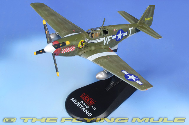 Don Gentile had claimed 21.8 aerial and six ground strafing kills by April 1944. This tally prompted Gen. Eisenhower to sub him a "one-man air force." Trained in Canada after being rejected by the USAAC, Gentile claimed his first kill with the RAF in Spitfires. He then scored two in USAAF spitfires and four in P-47s, before converting onto the P-51st claiming an additional 15.5 up to April 13, 1944. The majority of his claims came in this aircraft, which became one of the best-known P-51s of the Eighth Air Force in WII. It was written off at the end of Gentile's last mission n April 13, 1944. He clipped the ground at Debden while eating up the airfield for the attending press, who had gathered to welcome him back from his final sortie. The aircraft broke its back in the resulting crash-landing. Gentile as subsequently killed in a post-war flying accident. Designed to meet an RAF requirement for fighter-bomber and reconnaissance aircraft, the P-51 Mustang was first flown on October 26th, 1940. This versatile aircraft was capable of escorting bombers on long-range missions, engaging in dogfights, and dropping down to destroy German targets on the ground. At least eight versions of the P-51 were produced, but it was the definitive P-51D that gave the Mustang its classic warbird appearance. Britain and the US both tested the airframe with the Rolls-Royce Merlin engine, which gave the aircraft tremendous performance gains. The Truman Senate War Investigating Committee called the Mustang "the most aerodynamically perfect pursuit plane in existence." © Copyright 2003-2025 The Flying Mule, Inc. The Legion Models range presents detailed, ready-made diecast models of military aicraft in 1:72 scale. Legion Models diecast airplanes feature: - Diecast metal construction with some plastic components.