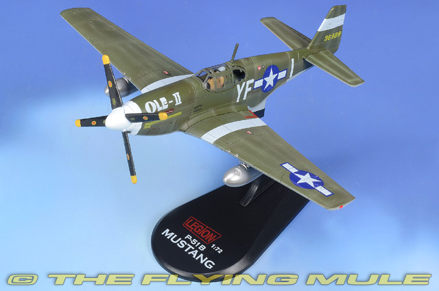 William Johnston Hovde was a United States Air Force colonel and a World War II flying ace. Hovde served two tours in the 355th Fighter Group and commanded the 358th Fighter Squadron, ending the war with 10.5 victories. He also served in the Korean War, claiming another victory while in command of the 335th Fighter Squadron. After serving as an attache in Mexico, Hovde commanded Ethan Allen Air Force Base and the 14th Fighter Group. He retired in 1967, and worked in the liquor business before finally retiring and moving to San Antonio. Hovde became president of the American Fighter Aces Association. Designed to meet an RAF requirement for fighter-bomber and reconnaissance aircraft, the P-51 Mustang was first flown on October 26th, 1940. This versatile aircraft was capable of escorting bombers on long-range missions, engaging in dogfights, and dropping down to destroy German targets on the ground. At least eight versions of the P-51 were produced, but it was the definitive P-51D that gave the Mustang its classic warbird appearance. Britain and the US both tested the airframe with the Rolls-Royce Merlin engine, which gave the aircraft tremendous performance gains. The Truman Senate War Investigating Committee called the Mustang "the most aerodynamically perfect pursuit plane in existence." © Copyright 2003-2025 The Flying Mule, Inc. The Legion Models range presents detailed, ready-made diecast models of military aicraft in 1:72 scale. Legion Models diecast airplanes feature: - Diecast metal construction with some plastic components.