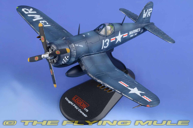 Marine Fighter Squadron 312 (VMF-312) was commissioned on 1 June 1943, at Page Field, Parris Island, South Carolina. The squadron transferred to Marine Aircraft Group 12, MCAS El Toro in July 1950 and was alerted for deployment and service in the Korean War. The first VMF-312 aircraft flew in Korea on 19 September 1950. Flying out of Wonson Air Base, the Checkerboards flew missions in support of the 1st Marine Division during the Battle of Chosin Reservoir. Redeployed in March 1951 aboard the light carrier USS Bataan (CVL-29), the Checkerboards were assigned escort and blockade missions. While aboard Bataan, the Checkerboards became the first piston engine squadron to shoot down a jet aircraft, when Captain Jesse Folmar shot down a MiG-15 jet fighter with 20 mm cannon fire. Designed to meet a US Navy requirement for a single-seat carrier based fighter, the F4U was first flown on May 29th, 1940. This versatile aircraft saw service with both the Navy and Marine Corps in WW II and in the Korean War. During its lifetime, the Corsair underwent numerous improvements such as a lengthened fuselage, a high visibility bubble-top canopy and folding inverted gull wings that provided clearance for a large propeller. Its performance advantage, 400 mph capability, the ability to withstand punishment and six .50 Browning machine guns made the F4U a devastating weapon against aircraft, ground targets and ships. © Copyright 2003-2025 The Flying Mule, Inc. The Legion Models range presents detailed, ready-made diecast models of military aicraft in 1:72 scale. Legion Models diecast airplanes feature: - Diecast metal construction with some plastic components.