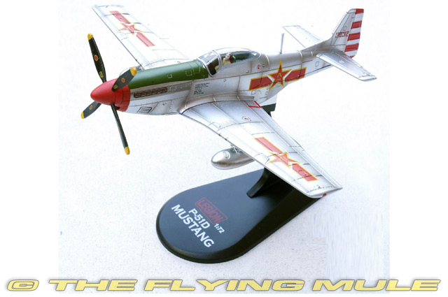 After the Chinese Civil War, the People's Liberation Army Air Force (PLAAF) captured several Republic of China Air Force P-51D and P-51K Mustang fighters left behind on mainland airfields in 1949. These aircraft were seized largely intact and evaluated by the newly formed PLAAF, which urgently needed modern fighters. Captured Mustangs were used for familiarization, limited training, and propaganda rather than frontline combat. Shortages of spare parts, ammunition, and maintenance support restricted their usefulness. The P-51s were soon supplemented and replaced by Soviet supplied aircraft such as the Yak-9 and MiG-15, accelerating the PLAAF's transition to jet powered air combat. Designed to meet an RAF requirement for fighter-bomber and reconnaissance aircraft, the P-51 Mustang was first flown on October 26th, 1940. This versatile aircraft was capable of escorting bombers on long-range missions, engaging in dogfights, and dropping down to destroy German targets on the ground. At least eight versions of the P-51 were produced, but it was the definitive P-51D that gave the Mustang its classic warbird appearance. Britain and the US both tested the airframe with the Rolls-Royce Merlin engine, which gave the aircraft tremendous performance gains. The Truman Senate War Investigating Committee called the Mustang "the most aerodynamically perfect pursuit plane in existence." © Copyright 2003-2026 The Flying Mule, Inc. The Legion Models 1:72 Aircraft range presents detailed, ready-made diecast models of military aicraft in 1:72 scale. Legion Models diecast airplanes feature: - Diecast metal construction with some plastic components.