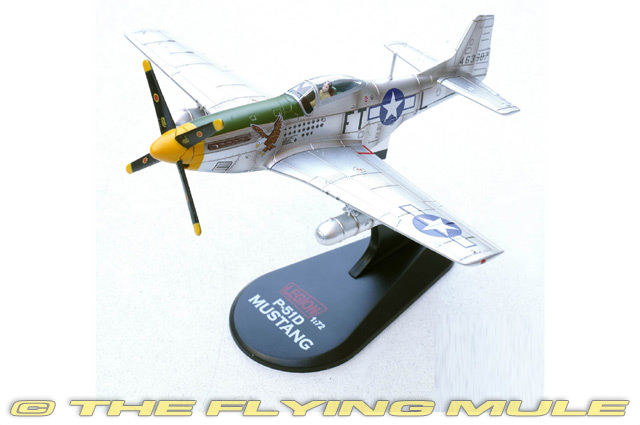 As a member of the 354th FG (Pioneers) and the 353 FS during WWII, Glenn Eagleston became their top ace with 18.5 victories, 2 more probable, 7 damaged aircraft and at least 5 more destroyed on the ground. His victories were achieved while flying P-47s and P-51s on almost 100 escort and fighter sweep missions over occupied Europe in 1944 and 1945. Eagleston quickly became known as a "fighter pilot's fighter pilot". On one mission Eagleston talked another P-51 pilot; that had difficulty maintaining flight and was going to bail out; all the way from Berlin to a safe landing in England. Eagleston survived the war and later became known for preserving the history of the Mustang and its pilots. Designed to meet an RAF requirement for fighter-bomber and reconnaissance aircraft, the P-51 Mustang was first flown on October 26th, 1940. This versatile aircraft was capable of escorting bombers on long-range missions, engaging in dogfights, and dropping down to destroy German targets on the ground. At least eight versions of the P-51 were produced, but it was the definitive P-51D that gave the Mustang its classic warbird appearance. Britain and the US both tested the airframe with the Rolls-Royce Merlin engine, which gave the aircraft tremendous performance gains. The Truman Senate War Investigating Committee called the Mustang "the most aerodynamically perfect pursuit plane in existence." © Copyright 2003-2026 The Flying Mule, Inc. The Legion Models 1:72 Aircraft range presents detailed, ready-made diecast models of military aicraft in 1:72 scale. Legion Models diecast airplanes feature: - Diecast metal construction with some plastic components.