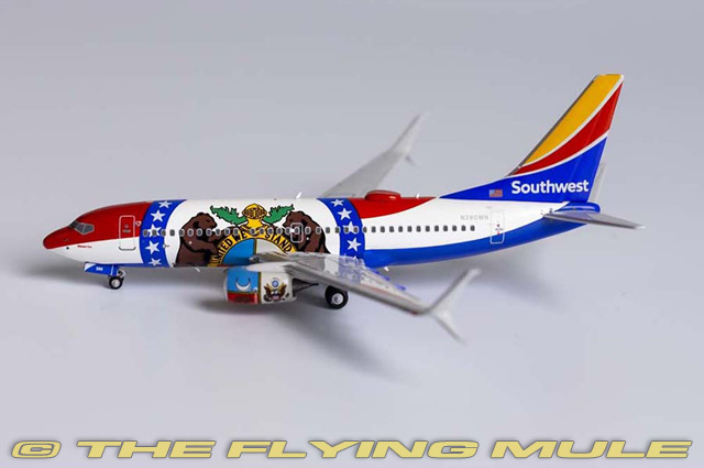 Since its inception Southwest Airlines has almost exclusively operated Boeing 737 aircraft (except for a brief period when it leased and flew some Boeing 727-200 aircraft). Southwest is the world's largest operator of the Boeing 737. Southwest added the Boeing 737-800 to its fleet on April 11, 2012. The aircraft has 175 seats, 38 more than the former largest 737s in Southwest's fleet. Southwest made its first flights out of Kansas City back in 1982 with six daily departures to two cities. Fast forward 30 years and the airline now serves 60 destinations and 156 departures originating from Missouri. To commemorate the anniversary, this Boeing was emblazoned with a painting of the Missouri state flag. Unveiled at a ceremony at Kansas City's Aviation Technical Services, this Boeing 737-700 is a high-flying representation of the Missouri state flag, prominently featuring the Great Seal of Missouri. The seal features two grizzly bears embracing the motto "United We Stand." The engine cowlings incorporate the center elements of the shield, including a crescent moon, a grizzly bear, and an eagle from the United States coat-of-arms. To accomplish this vibrant new paint scheme, a 45-person team worked 24 hours a day for nearly 10 days. Ten different dramatic colors and 56 gallons of paint were applied to the fuselage, wings and tail to create the one-of-a-kind work of art. The two grizzly bears stand more than 15 feet tall and 9 feet long. Designed as a smaller, short-ranged alternative to the Boeing 707 and 727, the 737 was first flown on April 9th, 1967. Over its long operational carreer, the 737 has spawned numerous variants ranging in capacity from less than 100 to more than 200 seats. In fact, the 737 series is the best-selling jetliner in aviation history with more than 6,500 aircraft manufactured to date and more than 4,500 still in service with over 500 airlines around the world. Incredibly, there is a 737 taking off or landing somewhere in the world, on average, every five seconds. © Copyright 2003-2025 The Flying Mule, Inc. The NG "1:400" range presents higly-detailed, ready-made diecast models of civilian aircraft in 1:400 scale. NG 1:400 diecast airplanes feature: - Diecast metal construction, including wings and tail surfaces.