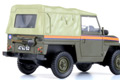 This 1/2 ton Lightweight Land Rover makes an appearance in a military role as an RAF Police vehicle, decorated in dark green with olive green canvas back and chrome bumpers. The distinctive red and blue Police band runs along the waist of the model on each side, while on the front, the RAF POLICE graphics are printed in white out of red across the radiator grille. Registered 47 AJ 52, the interior is dark green with black seating and a final exterior detail sees the RAF roundel printed quite small on the rear nearside wing.