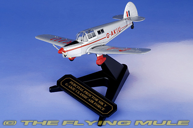 The original Proctor aircraft, designed by Edgar Percival, was a British plane produced at the Percival factory in response to an Air Ministry requirement in 1939 for a radio trainer and communications plane. It was a single-engined, low-wing monoplane with seating for three or four, depending on the model. The type was put into production as a Second World War aircraft for the RAF and the Fleet Air Arm. Developed from the Percival Vega Gull, the early Proctors followed the design quite closely but the later Marks IV and V were a completely redesign of the originals and proved to have less than adequate flight performance, amongst other shortcomings. Only 1143 Proctor Percivals in total were ever built. The Mk V was a civil model derived from the Proctor IV and put into production for private owners, business and light charter. Only 150 of the type were built and the RAF purchased four of these four seaters for use by air attaches. This 1:72 scale replica G-AKIU is in the livery of an aircraft used by the British Embassy in Washington, DC. With silver bodywork and red lettering on the upper and lower wings, additional detail sees the model with black anti-glare panel, red stripe along the fuselage and black tyres, engine and intakes. The propellers are silver with yellow tips and red spinner. Following its withdrawal from service, the real aircraft passed through several owners over the years before being acquired in 1999 by Mike Collett, Classic Air Force Chairman. Fully restored by a dedicated team of experts, G-AKIU is now once again airworthy, owned by Air Atlantique and on view at Coventry Airport.