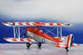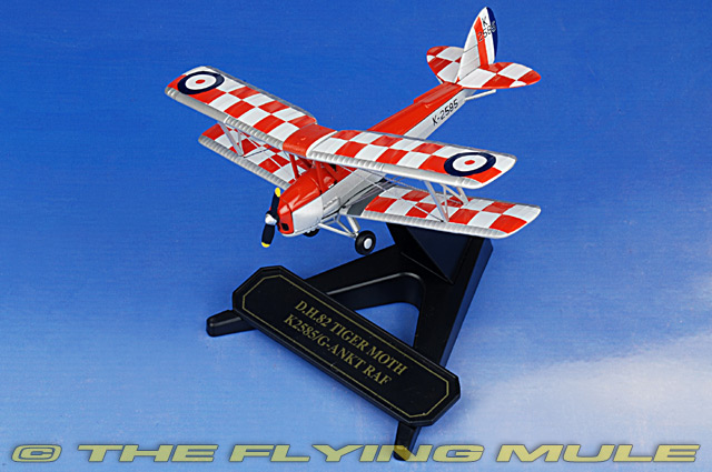 The DH 82 Tiger Moth bi-plane designed by Geoffrey de Havilland took its first flight in 1931. Between then and 1944 almost 9000 were produced with one of the key uses being that of a training aircraft. Many survived and the aircraft which we have modelled here is as used by the RAF's Central Flying School. Our 1:72 scale replica featuring the red/white and blue RAF roundel on the upper wings is colourfully decorated with red and silver fuselage, red and white chequered upper wings and tail and silver under body. The identification markings on the underwings and along the rear fuselage are printed in black. The fine wing struts, propeller spinner and wheel hubs are also silver, whilst other details are finished in black.