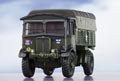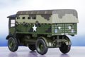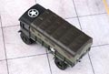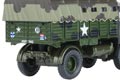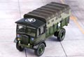 This AEC Matador was used towards the very end of WWII. The cab is decorated in drab olive green and dark grey camouflage effect to the sides with a dark grey roof. The interior is moulded in olive green with a black steering wheel. The canvas back and bodywork are painted in drab olive green with brown camouflage markings and brown roof. The rope "ties" between the canvas back and the body are cleverly printed in beige to achieve a realistic effect. Another spot of realism is achieved with the rear canopy windows which have been masked to show clear plastic moulding. The rough terrain wheels have olive green inserts and the whole vehicle is mounted on an olive green chassis. Military lettering is printed in white with additional colour to the Battalion shield and vehicle numbering.