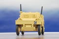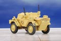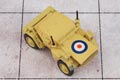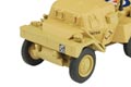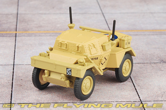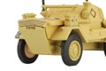This 1:76 scale WWII armoured car appears in desert camouflage as used in its liaison role by the Allies in North Africa. Decorated almost completely in matt sand, the interior is a drab olive colour while additional detail comprises light brown fuel can straps, black aerials and aerial bases and rust coloured exhausts. The military markings are printed in black, relieved by the red, white and blue RAF roundel on the vehicle bonnet.